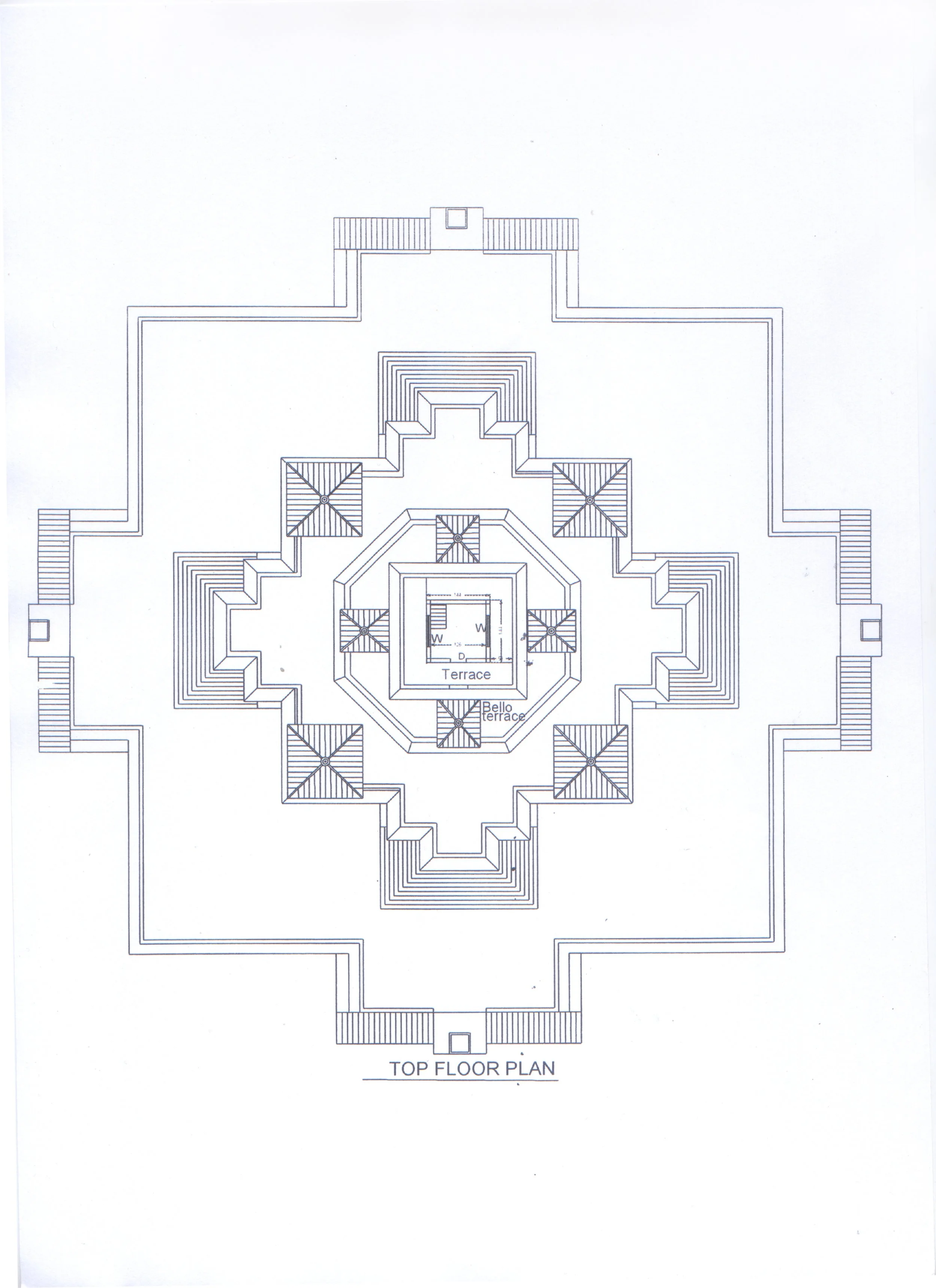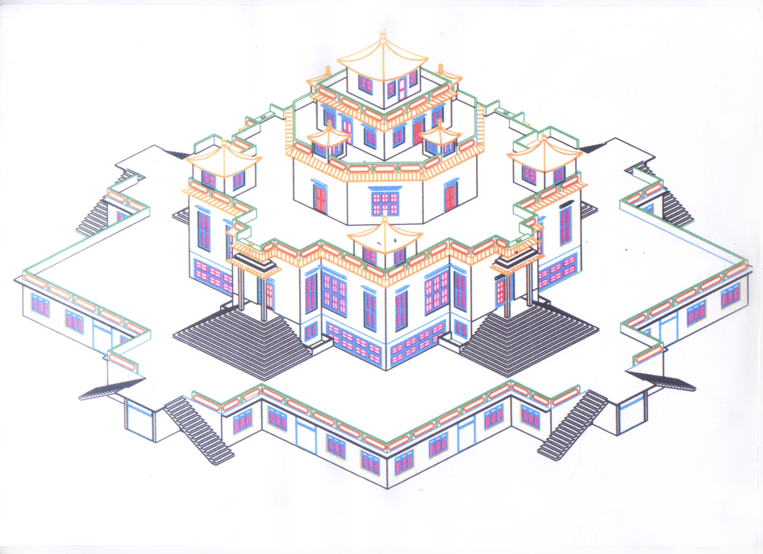 In this Phulchok Zangdok Palri, the ground level consists of a large, open space that will be used for special practice occasions when many people come together; it is large enough to fit several hundred people. The second storey includes residences for lamas at the four corners, and in the center will be the main shrine room for public practices. On the third floor begins the actual palace of Guru Rinpoche’s pure land, the Lotus Light Palace (Padma Öd), which tops the Glorious Copper-Colored Mountain, with each floor representing one of the three kayas (bodies of truth) and its representational Buddha.